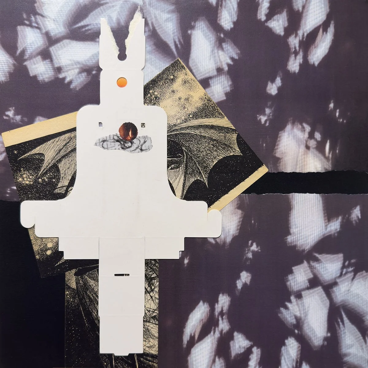 “Penumbra,” collage on watercolor paper (including elements from Cut Me Up, Issue 12), photographed to include cast shadow of spring branches, 10.25 x 8.25,” ©2024, Janice McDonald.